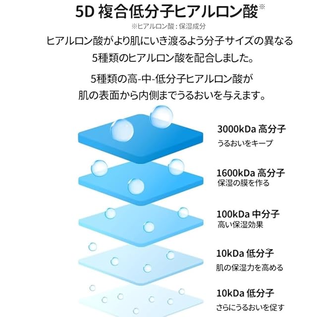 低・中・高分子の5種類のヒアルロン酸※1はもちろんのこと、肌荒れを防ぐ6種類のハーブエキス※2を配合し、乾燥ダメージを受けたお肌を保湿。※1 ヒアルロン酸Na、加水分解ヒアルロン酸、ヒアルロン酸クロスポリマーNa、加水分解ヒアルロン酸Na、アセチルヒアルロン酸Na(全て保湿成分)※2 ルリジサ、ヤグルマギク、ラベンダー、カモミール、クラリセージ、ヒヤシンス(全て整肌成分)