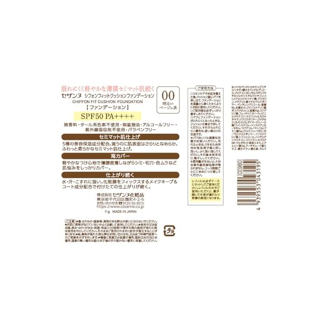 商品名:セザンヌ シフォンフィットクッションファンデーション 00 明るいベージュ系 11g SPF50 PA++++ 崩れにくく高カバーなセミマットクッションファンデ