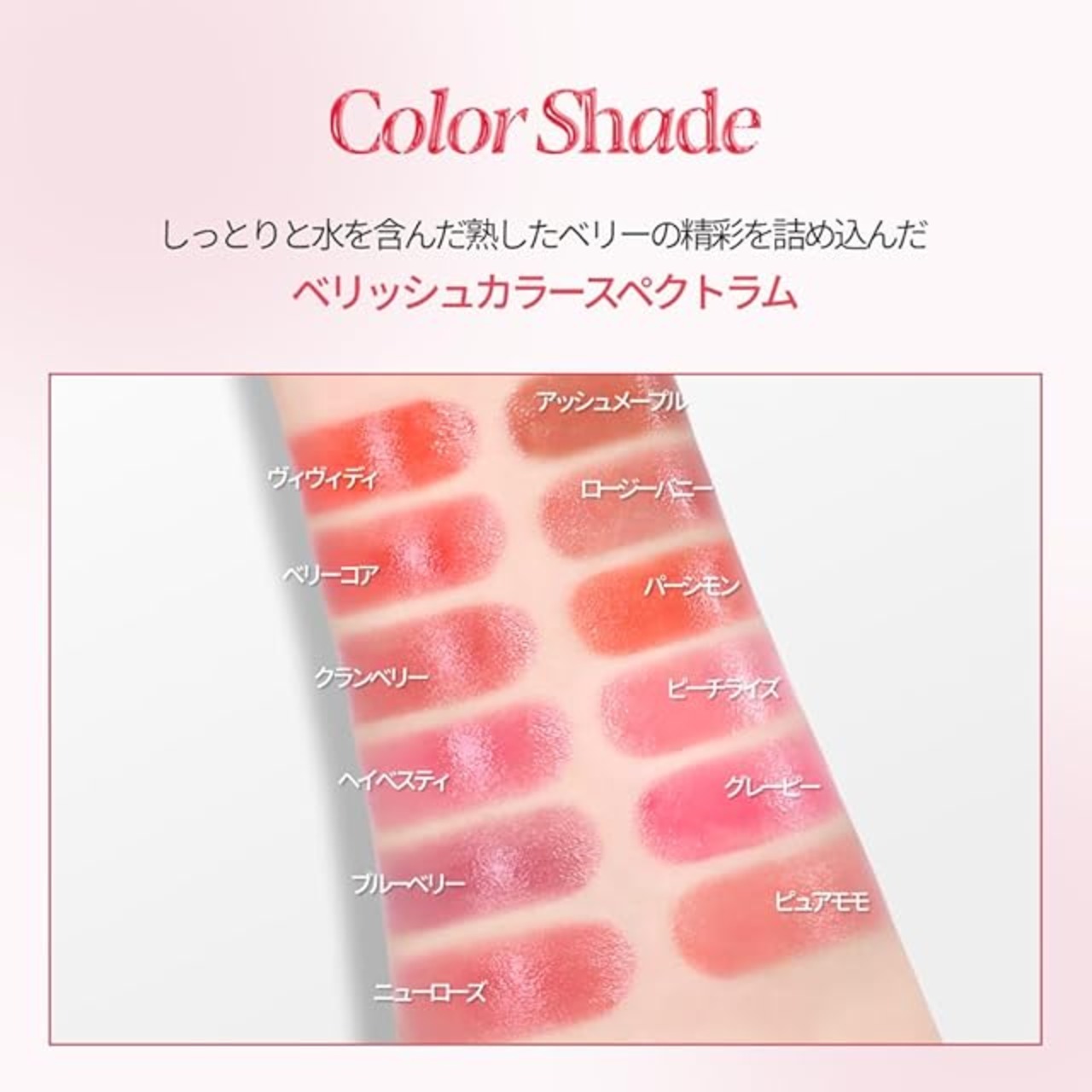 クリアな発色の11色カラーバリエーション:11色のバリエーションは様々な肌トーンに対応しており、どなたでも自分に合った色を簡単に見つけることができます。透明感のある発色で、唇にしっかりと密着し、唇本来の美しさを引き立てます。#1 ヴィヴィディはイエベ向けのコーラルオレンジレッド、#2 ベリーコアはブルベ・イエベ兼用のニュートラルピーチレッド、#3 クランベリーはイエベ向けのベリーカラー、#4 ヘイベスティはブルベ向けのピンク、#5 ブルーベリーはブルベ向けのベリーモーブ、#6 ニューローズはニュートラルなソフトローズ、#7 アッシュメープルはイエベ向けのブラウンベージュ、#9 パーシモンはイエベ向けのブリックレッド、#10 ピーチライズはソフトなピーチベージュ、#11 グレーピーはブルベ向けのクールピンクです。