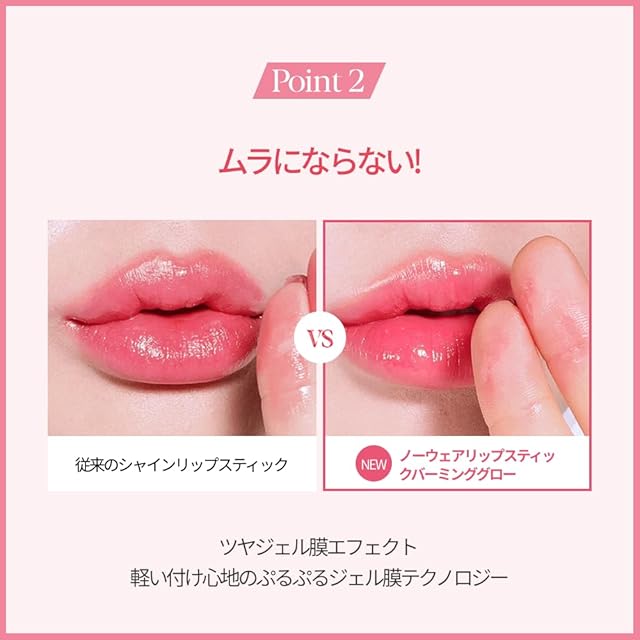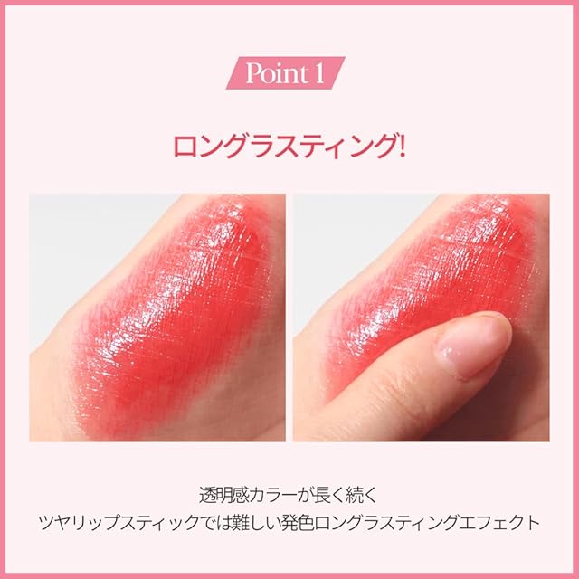 ムラにならないツヤジェル膜エフェクト: 軽い付け心地のぷるぷるジェル膜テクノロジーを採用。色は密着させずにツヤと分離し、しっとりとした透明感のある仕上がりを実現します。唇に均一なツヤ感を与え、自然な輝きを演出しながら色落ちを最小限に抑えます。