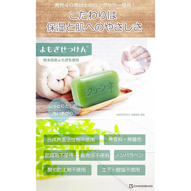 【熊本県産よもぎエキス配合の無添加石けん】保湿成分として熊本県産のよもぎエキスを配合し、肌に潤いを与える天然油脂原料の無添加石けんです。