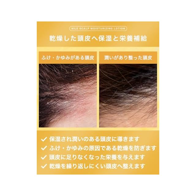 【使用方法】ドライヤーで乾かした後、NILE頭皮保湿ローションを一部ではなく全体に塗布し、指の腹で優しく馴染ませてください。