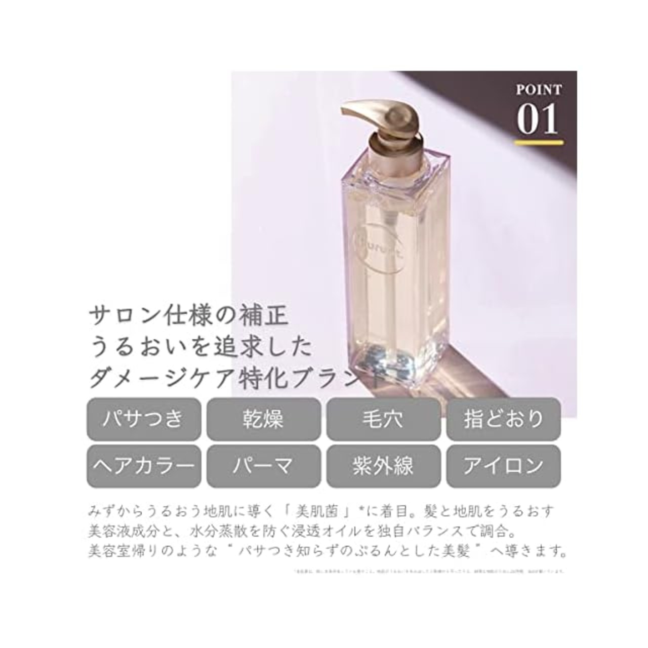 《 Purunt. (プルント) とは 》美容室メーカーが366日かけて開発した貯水オイル美容をコンセプトにした「パサつき・乾燥」特化型ダメージケアブランド。うるおいを追求したサロン仕様の補修機能成分に加え、厳選浸透オイルと、みずからうるおうチカラ“ 美肌菌 ”に着目したうるおい処方の独自調合で、美容室帰りのような“ パサつき知らずのぷるんとした美髪 ”を叶えます。