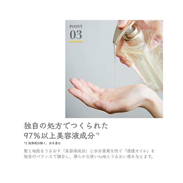 《 97%以上*美容液成分 》独自の調合でつくられた髪と地肌をうるおす「美容液成分」と水分蒸発を防ぐ「浸透オイル」を独自のバランスで調合し、滑らかな使い心地とうるおい感を与えます。(*6種の浸透保湿成分 カムカムエキス/ツボクサエキス/プラセンタエキス/ビタミンC誘導体/ビタミンA誘導体/ビタミンE) また、髪と地肌をいたわる7つ以上の無添加・フリー設計です。