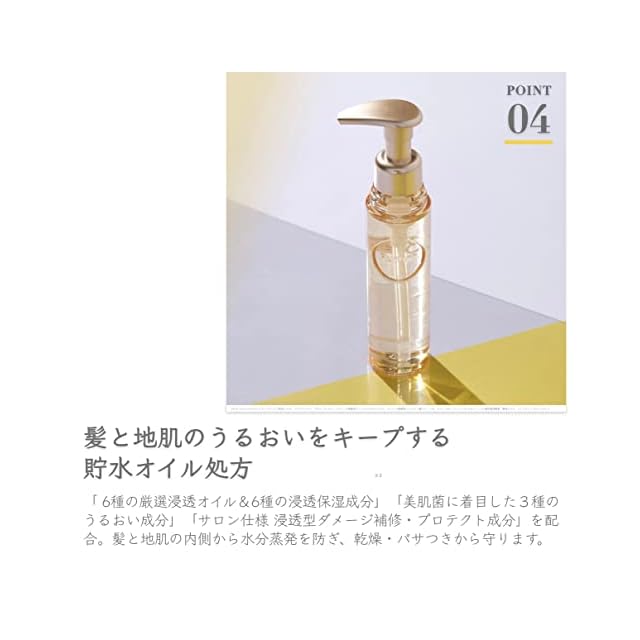 《 貯水オイル処方 》スキンケア発想「 shampoo(整える) + treatment(補う・守る) + oil(集中ケア) 」の隙なし3段階保湿ケアのアプローチで、髪と地肌に確かな保湿力とうるおいを与えます【 シャンプー 】選択式吸着機能成分ヒドロキシアパタイト配合。汚れの原因を選択的に洗浄し、必要なうるおいをキープ【 トリートメント 】キューティクルケア成分加水分解シルク*と加水分解ケラチン(羊毛)配合。なめらかな指通りの良い髪へ(*(加水分解シルク/PGプロピルメチルシランジオール)クロスポリマー)【 ヘアオイル 】サロン仕様 浸透型ダメージ補修・プロテクト成分ジラウロイルグルタミン酸リシンNa配合。傷んだ髪の内部まで浸透・集中修復し、髪を保護