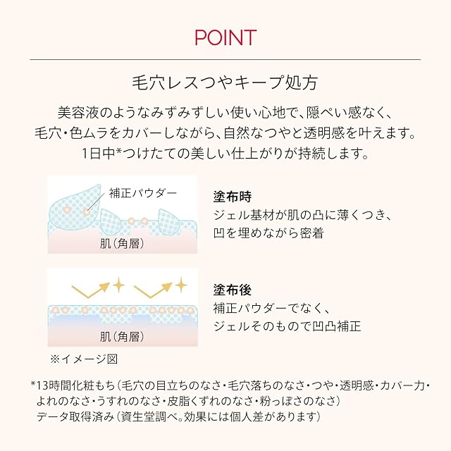 【13時間化粧もち】(毛穴の目立ちのなさ・毛穴落ちのなさ・つや・透明感・カバー力・よれのなさ・うすれのなさ・皮脂くずれのなさ・粉っぽさのなさ)データ取得済み (メーカー調べ。効果には個人差があります。)
