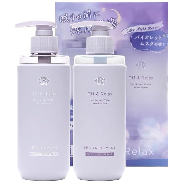 髪と地肌に、スパの恵みを『頭皮のの汚れをOff』&『頭皮を整えてRelax』<br> <br> 「ナイトケアで深層補修、シルクのように煌めく髪へ」<br> 髪のダメージケアと頭皮ケアの新バランスを提案。<br> Off&Relaxシリーズの最高峰の指通りの良い洗い上がりをお楽しみください。<br> <br> ・トリプルタウリン処方<br> 独自の処方技術でお眠りの間にも髪と頭皮にパワーチャージ<br> しっかり浸透補修し、健やかな頭皮と髪に導きます<br> <br> ・ヒートプロテクトテクノロジー<br> 熱ダメージを防いでドライヤー後も美しい髪に<br> <br> ・髪を労わる5大美容成分<br> サロン帰りのような指通りと艶めきを<br> ユズセラミド、コエンザイムQ10、トレハロース、高保湿型ヒアルロン酸、大豆タンパク<br> <br> ・厳選ボタニカルエッセンス<br> 紅藻、ブドウ、センブリ、カモミール、コメ、甘草<br> <br> 〇シルキーナイトリペアタイプ<br> 日中の紫外線、日頃のパーマやカラーリングなどで髪は深刻なダメージを。<br> ナイトケアで、髪ダメージの予防と補修をし、しなやかな指通りの髪へ導きます。<br> <br> 『Off&Relax OR スパ・シャンプー シルキーナイトリペア』<br> トリプルタウリン配合し、髪と頭皮の汚れを優しく落とし、髪にハリ・コシを与えます。<br> <br> 『Off&Relax OR スパ・ヘアトリートメント シルキーナイトリペア』<br> 独自のヒートプロテクトテクノロジーで、髪を紫外線やドライヤーなどの熱ダメージから守り、髪を労わる5大保湿成分を配合して、乾燥知らずな髪へ。<br> <br> バイオレットムスクの香り<br> フレッシュなグリーン感が特徴のバイオレットの香りにカシス、アップル、ワイルドストロベリー、アプリコットなどの瑞々しいフルーティーノートを合わせ。清潔感のあるミュゲと柔らかなムスク、サンダルウッドを重ねた明るく心躍る香り。<br>