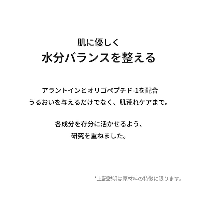 5D-複合ヒアルロン酸※1が肌の角質層までうるおいを与え、アラントイン※2とオリゴペプチド-1※3が肌荒れケアまで。※1 ヒアルロン酸Na、加水分解ヒアルロン酸、ヒアルロン酸クロスポリマーNa、加水分解ヒアルロン酸Na、アセチルヒアルロン酸Na(全て保湿成分)※2 整肌成分 ※3 保湿成分