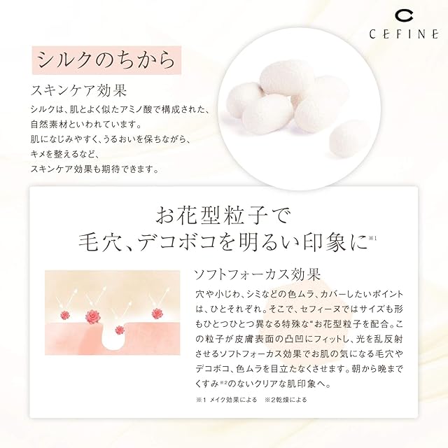 シルク生まれのパウダーファンデーション つけているのを忘れさせる、自然で軽いつけ心地のパウダーファンデーション。 ファンデーション粉体が、吸いつくような軽やかさで肌になじみ、カバーしながらお肌をふんわりとした印象に。 シルクパウダーと、ヒアルロン酸などの保湿成分がしっとりさらさらに仕上げます。 時間がたってもくずれにくいので夜までくずれません。