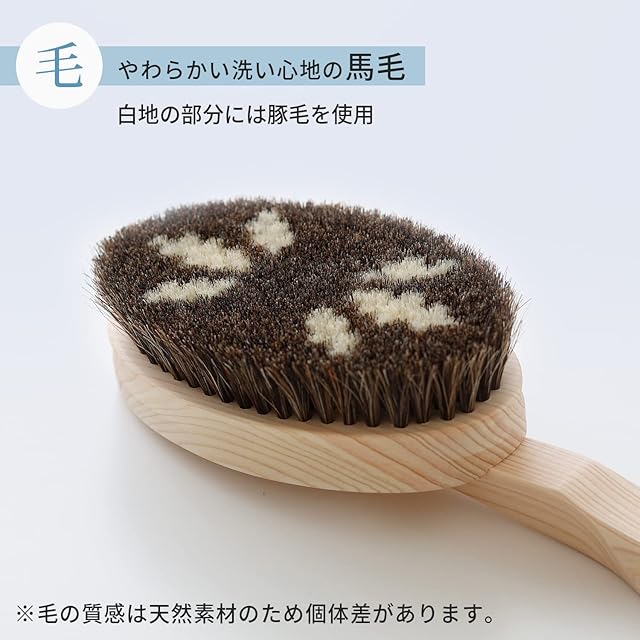 【肌に優しい天然素材使用】天然素材を使用したやさしい雰囲気のボディブラシです。ブラシ部分ハリやコシのある馬毛を80%、豚毛を20%使用。泡立ちが良く、さっぱりとした洗い心地です。