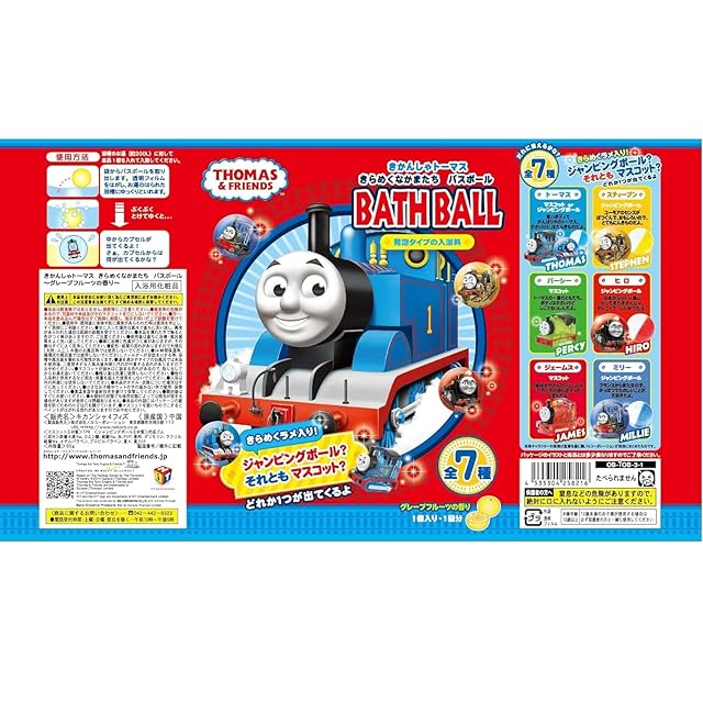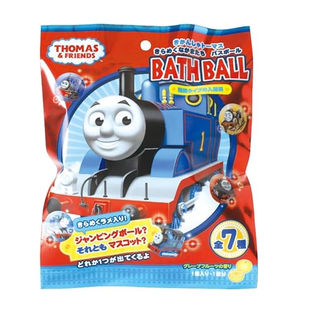 ●きかんしゃトーマスのかわいいマスコットかジャンピングボールの入った発泡タイプの入浴料。 ●マスコットは使ってみないと分からないため、お風呂の時間を楽しむことができます。お子様にも喜ばれそうなバスボール。 ●マスコットは全部で3種類 (トーマス、パーシー、ジェームス)、ジャンピングボールは4種類 (トーマス、スティーブン、ヒロ、ミリー)。