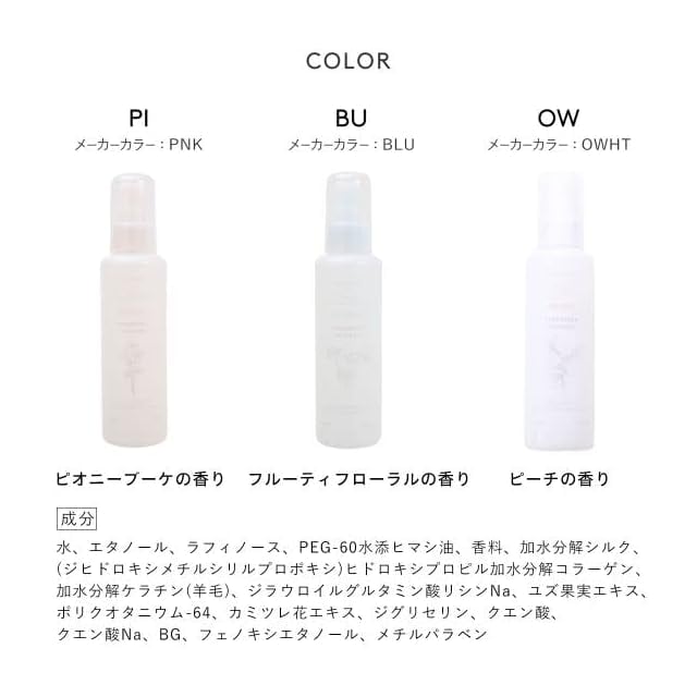 カラーやパーマで傷んだ髪に潤いを与えて、まとまりよく仕上げるヘアミスト。ユズエキス・カミツレエキスを配合しています。<br><br>ヒートコートプロテインが、ドライヤーやヘアアイロンの熱から髪を守ってくれるのも嬉しいポイントです。<br><br>さわやかな香りで、使うたびに癒されること間違いなし。<br><br>フレンチシックでお洒落なパッケージも魅力。<br><br>PNK:ピオニーブーケの香り<br>BLU:フルーティフローラルの香り<br>OWHT:ピーチの香り<br><br>150ml