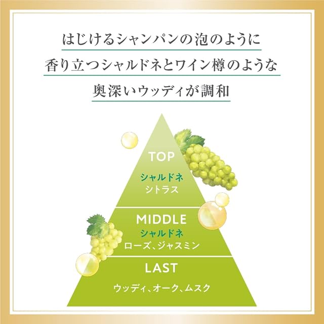 トップノート:シャルドネ、シトラス ミドルノート:シャルドネ、ローズ、ジャスミン ラストノート:ウッディ、オーク、ムスク