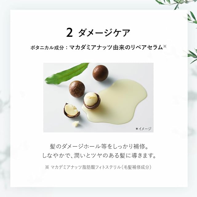 シャンプー トリートメント 詰替え セット 「髪を自然で満たしきる」 まとまりのある、しっとりとした髪に洗い上げます。 華やかで優雅なアプリコットとジャスミンの香り [シリコンフリー パラベンフリー 合成着色料フリー サルフェート※1 フリー] ①全バリアントに新配合成分を含む共通成分「濃密ボタニカル美容液※2」 「濃密ボタニカル美容液※2」が叶える3つのケア ・地肌ケア … 2種のシラカバウォーター※3、グリチルリチン酸2K(保湿成分) ・保湿ケア … サトウキビ糖蜜※4、コメセラミド※5(ナノ化) ・ダメージケア … マカダミアナッツオイル※6(ナノ化)、ボタニカルマイクロプロテイン※7 ②5種の仕上がりのラインナップごとに厳選した植物成分を配合 アンズ核油(保湿成分) ③環境に優しい CO2排出削減ボトル、バイオマスインキ使用ラベル ※1 硫酸系界面活性剤 ※2 シラカンバ樹液、ガラクトミセス/シラカンバ樹液発酵液、トウミツ、スフィンゴ糖脂質(全て保湿成分)、マカデミアナッツ脂肪酸フィトステリル、加水分解野菜タンパク(全て毛髪補修成分) ※3 シラカンバ樹液、ガラクトミセス/シラカンバ樹液発酵液(すべて保湿成分)※4 トウミツ(保湿成分)※5 スフィンゴ糖脂質(保湿成分) ※6 マカデミアナッツ脂肪酸フィトステリル(毛髪補修成分)※7 加水分解野菜タンパク(毛髪補修成分)