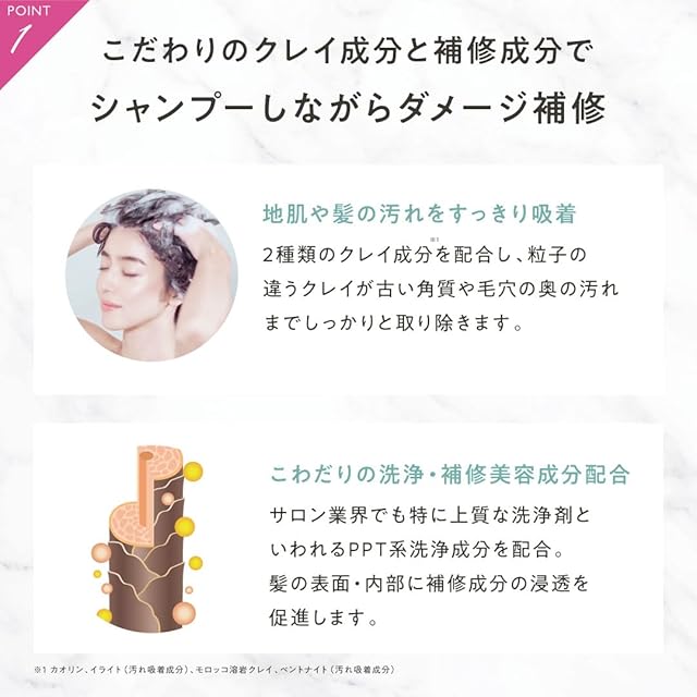 【優しく洗う】モロッコ溶岩クレイ由来のミネラルクレイとピンククレイのWクレイ処方で毛穴の奥と頭皮表面をの汚れを吸着