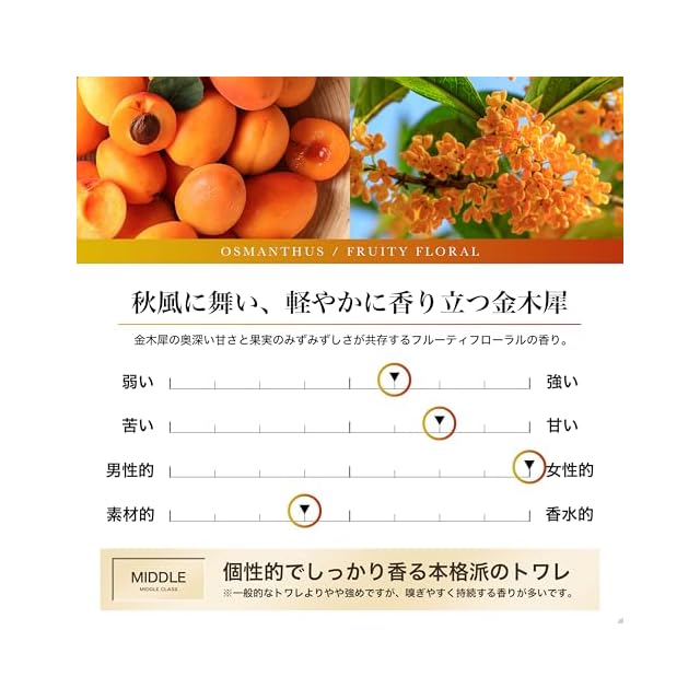 【金木犀の奥深い甘さとアプリコットの瑞々しさが共存】甘美な芳香をアプリコットの透明感が中和し、街角に香る軽やかな金木犀を表現したフルーティフローラルノート。冬空を予感させるウッディムスクが甘美な芳香を引き締め、奥ゆかしく品のある女性らしさを引き立てます。