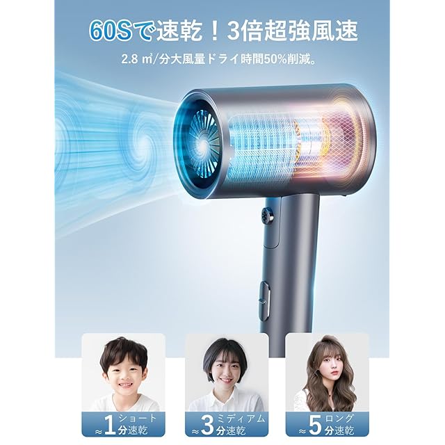 【3倍超強風&60S速乾】ドライヤー 最高回転数110,000rpmの高速ブラシレスモーターを搭載し、3倍の強力な風速を実現しています。髪の表面の水分を素早く除去し、乾燥時間を50%短縮できます。忙しい朝もさっと乾かして、すっきりとした気分で外出できます。