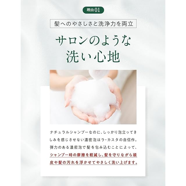 【サロンクオリティ】髪へのやさしさと洗浄力を両立した、サロンのような洗い心地。ナチュラルシャンプーなのに、しっかり泡立ってきしみを感じさせない濃密泡。シャンプー時の摩擦を軽減し、髪を守りながら頭皮や髪の汚れを浮かせてやさしく洗い上げます。