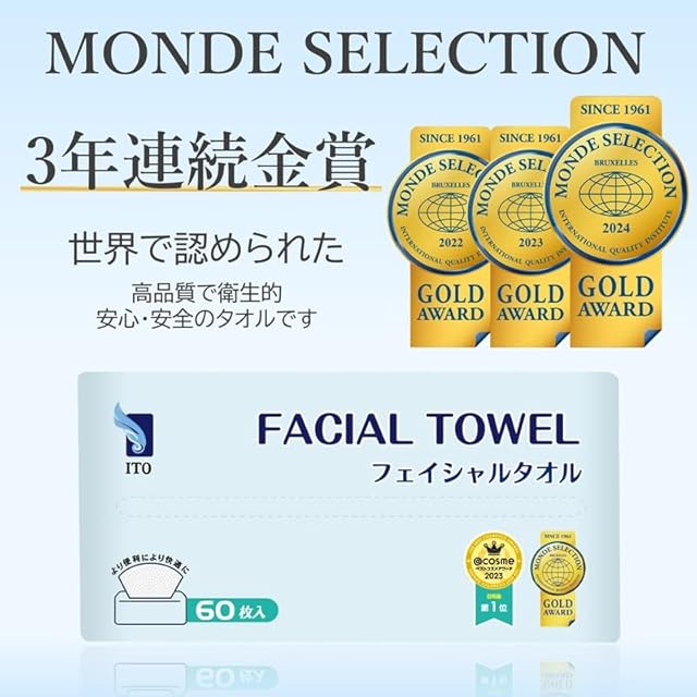 ITO フェイシャルタオル (単品) 60枚入 クレンジングタオル OEKO-TEX®認証 赤ちゃんにも優しい コットンタオル 使い捨てタオル 敏感肌 肌荒れ対策 フェイスケア ITOオリジナル鮫小紋エンボス スキンケアタオル | LIS MART