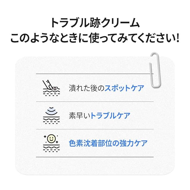 1. トラブル後、跡が残ったときに塗ると優れた効果 2. カタツムリ粘液ろ過物と高濃縮CICAで肌の自生力を強化 3. ノーベル賞受賞のEGF含有で健康な肌へ 4. トラブル跡ケアに対する特許成分TOH COMPLEX配合 5. 皮脂減少、保湿増加、肌の低刺激に対する人体適用実験完了