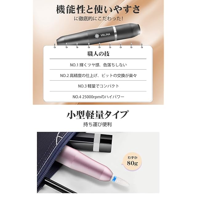 【コンパクト・静音】市販の小型ネイルマシンより一回り小さく、スリムな形をしていて、手の小さめな方でも握リ安い。本体がアルミ製で、高い強度を持ちながら軽量を実現!また衝撃を吸収するベアリングを使用している為、騒音と振動を低減し、長時間使っても手が傷みません。ビットをしっかり固定しながら、女性でもツールなしで、簡単にビットの交換ができます。