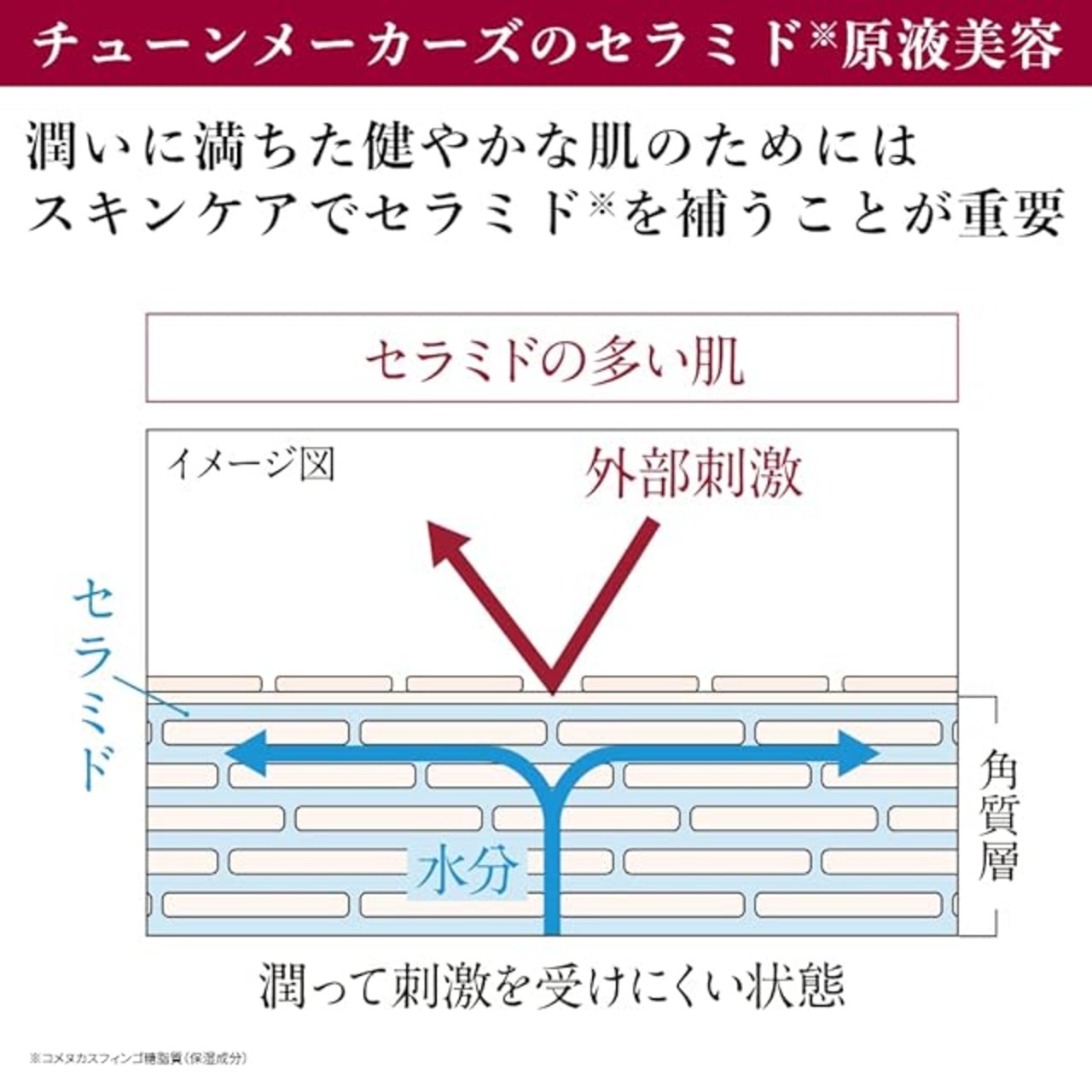 【原液保湿水】原液を混ぜ、潤いを極めた*化粧水。乾燥を潤す5種の「原液」を独自の”うるおい比率*1”で調合し、「原液」と「肌と同じ弱酸性の水※」でつくった、ごくシンプルな化粧水です。肌につけた瞬間ぐんぐん浸透*2し、潤いを蓄えたしっとり柔らかな肌へ。敏感肌にもお使いいただけます。<br><br>※基剤 *チューンメーカーズ「弱酸性水」比 *1およその比率 *2角質層まで<br>原液保湿水の原液とは:チューンメーカーズ「セラミド(コメヌカスフィンゴ糖脂質(保湿成分))」「ヒアルロン酸(保湿成分)」「ハチミツ(保湿成分)」「コラーゲン(保湿成分)」「ローヤルゼリーエキス(保湿成分)」<br><br><br>【原液保湿クリーム】原液を混ぜ、角質層のすみずみまで潤う「原液保湿クリーム」。肌に潤いを与えて閉じ込める、5種の「原液」を独自の”うるおい比率”で調合。肌にスッと浸透*して潤いで満たし、ゴワついた肌もふっくら*1柔らかい肌へ。さらにオイル原液*2が潤いヴェールをつくり、乾燥や刺激から肌を守ります。<br><br>*角質層まで *1潤いにより肌にハリを与えます *2チューンメーカーズ「アルガンオイル(アルガニアスピノサ核油(保湿成分))」「スクワラン(保湿成分)」<br>原液保湿クリームの原液とは:チューンメーカーズ「セラミド(コメヌカスフィンゴ糖脂質(保湿成分))」「アルガンオイル(アルガニアスピノサ核油(保湿成分))」「ヒアルロン酸(保湿成分)」「スクワラン(保湿成分)」「コラーゲン(保湿成分)」