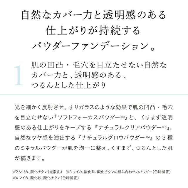 全成分:成分:マイカ、スクワラン、野菜油、水酸化Al、オリーブ果実油*、ホホバ種子油*、ヒポファエラムノイデス果実油*、キサントフィル、クロフサスグリ種子油*、タチジャコウソウ花/葉エキス*、ラウロイルグルタミン酸ジ(フィトステリル/オクチルドデシル)、ステアリン酸、ジミリスチン酸Al、スクロース、タピオカデンプン、トコフェロール、水、BG、アルミナ、ステアリン酸Mg、(+/-)酸化チタン、酸化鉄、シリカ *オーガニック成分
