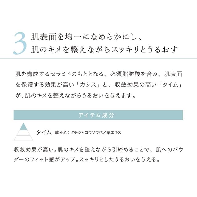 全成分:成分:マイカ、スクワラン、野菜油、水酸化Al、オリーブ果実油*、ホホバ種子油*、ヒポファエラムノイデス果実油*、キサントフィル、クロフサスグリ種子油*、タチジャコウソウ花/葉エキス*、ラウロイルグルタミン酸ジ(フィトステリル/オクチルドデシル)、ステアリン酸、ジミリスチン酸Al、スクロース、タピオカデンプン、トコフェロール、水、BG、アルミナ、ステアリン酸Mg、(+/-)酸化チタン、酸化鉄、シリカ *オーガニック成分