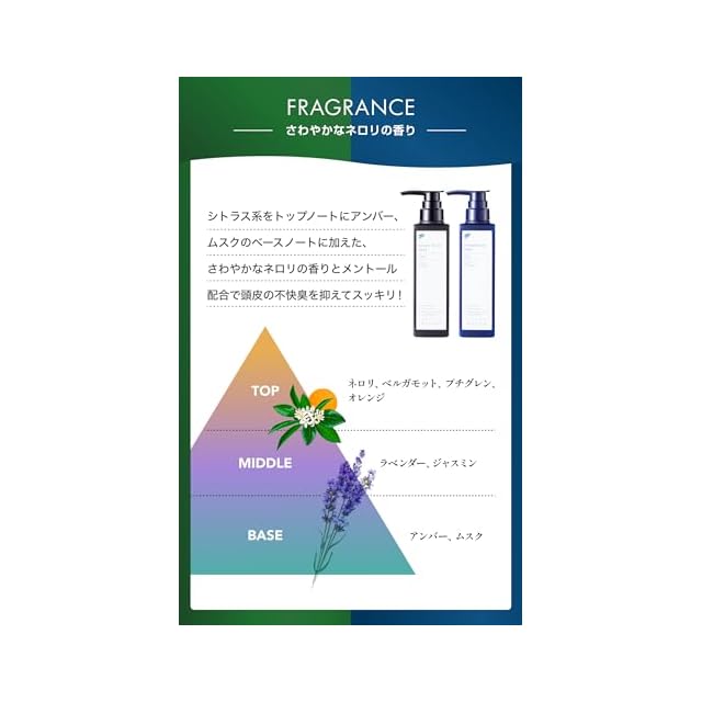 ✅【さわやかなネロリの香り】シトラス系をトップノートにアンバー、ムスクのベースノートに加えた、さわやかなネロリの香りとメントール配合で頭皮の不快臭を抑えてスッキリ!