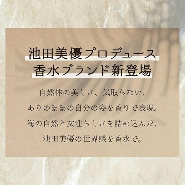 ■Concept 「ナチュラル&エフォートレス」 無理に作りこまない自然体の美しさ、気取らないありのままの自分の姿を香り で表現。池田美優さんのインスタグラムの世界観をそのまま表現したような、 海の自然と女性らしさを感じられる香水。