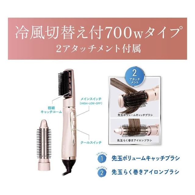 アタッチメント:根本から髪を逃さずボリュームアップできる先玉ボリュームキャッチブラシと、アルミ素材で毛先のカールスタイルが作れる先玉らく巻きアイロンブラシの2種類
