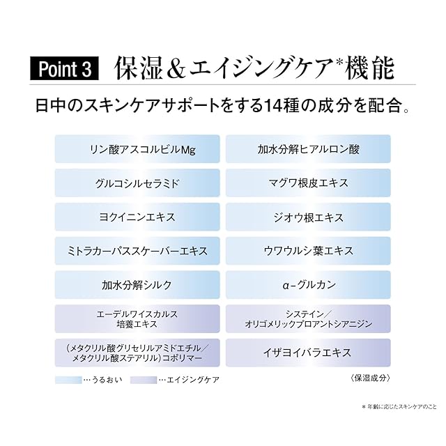 全成分:シクロペンタシロキサン、水、酸化亜鉛、BG、シクロメチコン、DPG、カプリリルメチコン、PEG-9ポリジメチルシロキシエチルジメチコン、トリイソステアリン酸ポリグリセリル‐2、ジメチコン、(ビニルジメチコン/メチコンシルセスキオキサン)クロスポリマー、(HDI/トリメチロールヘキシルラクトン)クロスポリマー、ジステアルジモニウムヘクトライト、ジイソステアリン酸ポリグリセリル‐2、リン酸アスコルビルMg、加水分解ヒアルロン酸、グルコシルセラミド、マグワ根皮エキス、ヨクイニンエキス、ジオウ根エキス、ミトラカーパススケーバーエキス、ウワウルシ葉エキス、加水分解シルク、α‐グルカン、エーデルワイスカルス培養エキス、システイン/オリゴメリックプロアントシアニジン、(メタクリル酸グリセリルアミドエチル/メタクリル酸ステアリル)コポリマー、ヒアルロン酸Na、グリセリン、PVP、ヒドロキシエチルセルロース、アルギン酸Na、キサンタンガム、キトサン、セテアリルグルコシド、ポリ-γ-グルタミン酸Na、イザヨイバラエキス、ナイロン‐12、PEG‐9ジメチコン、(ジメチコン/ビニルジメチコン)クロスポリマー、ステアリン酸、硫酸Mg、イソステアリン酸、ハイドロゲンジメチコン、クエン酸Na、ペンテト酸5Na、クエン酸、ビオサッカリドガム-1、アルミナ、ヒドロキシアパタイト、ポリメチルシルセスキオキサン、フェノキシエタノール、 [+/-] 酸化チタン、タルク、酸化スズ、メチコン、酸化クロム、グンジョウ、マイカ、シリカ、酸化鉄、水酸化Al