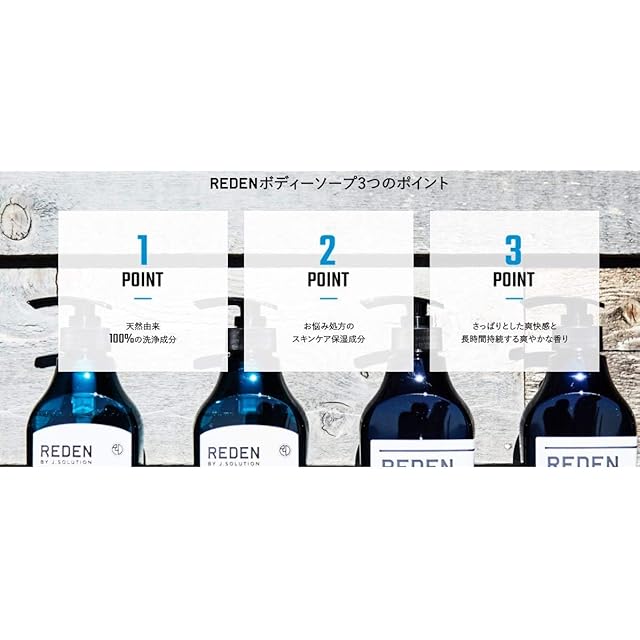 REDENから待望のボディソープが誕生。<br>リデンボディソープは、洗浄成分が100%天然由来の肌に優しいボディーソープです。<br>石鹸系の洗浄成分はサッパリとした洗い上がりが特徴で、男性の身体の汚れをしっかりと落とします。<br>石鹸で身体を洗うと、泡切れの良い使用感と、洗い流した後 の肌に残った石鹸膜でキュキュッとする感覚が残ります。<br>リデンボディソープは、石鹸系洗浄成分と低刺激洗浄成分と組み合わせることで潤いある滑らかな肌の仕上がりを実現し ています。<br> 肌に残った石鹸膜は皮脂成分の一つである脂肪酸を含んでおり、時間と共に肌を保湿するようになる効果があります。<br>また、弱アルカリ性で、弱アルカリ性洗浄成分は、しっかりと汚れ落とし、肌力を育てていく優れた効果を発揮します。