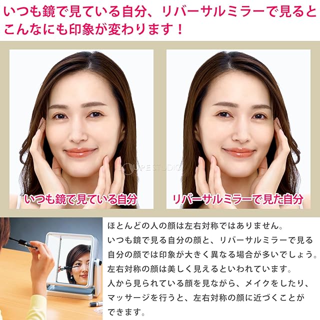 ■画期的!他人からみた自分が見える卓上ミラー■左右が入れ替わる!他人からみた自分が見える!左右反転鏡(リバーサルミラー)。裏面は普通の鏡。メイク後、裏返して人から見える姿を確認できます。■あれ?自由の女神の手が...鏡なのに逆に映ってる!そう、これが『リバーサルミラー』のすごいところなんです。2枚の鏡を直角に向き合わせ、1枚の鏡に映った像が反対の鏡に反映され、左右が入れ替わるのです。つまり、【人から見た自分】をチェックできるということ!元来、人の顔は完全に左右対称ではありません。ですから正しいと思っていた眉毛の形や、髪の分け目なども人から見た状態と鏡で見ている状態では違うのです。普通の鏡も付いているから、メイクしてから裏返しておかしくないか確認すればバッチリ!!『リバーサルミラー』で左右のバランスを直して、本当の美しさを手に入れてみませんか?『リバーサルミラー』は鏡メーカー「ヤマムラ」のオリジナル商品です。