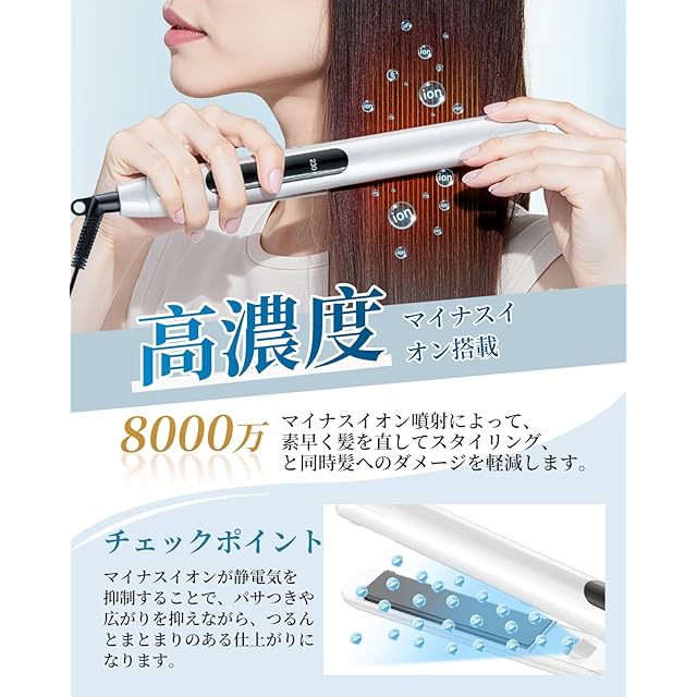 【高濃度マイナスイオン搭載・髪へ潤いとツヤ感を与え】:ダメージを起こさないケアに大切な3要素「水・熱・圧」に基づいて従来品より品質を向上したこのヘアーアイロンは、挟む力もよりアップ、出る熱と髪の水分量をある程度でコントロールし、水分がギュッと詰まったレア質感を作り出してサロン帰りの髪のようなしっとりやわらかな髪を保持します。※ご注意:効果は、使用環境・髪質により異なリます。それに、静電気が起こりやすい髪質の人にとっては、高濃度マイナスイオン搭載されたこのヘアーアイロンは一番!なぜかというと、静電気がプラスイオンなので、そこにアイロンによって発生したマイナスイオンで中和させ、静電気を抑制できるというわけですね。マイナスイオンが発生すると空気中の水分が細分化されて微粒子になることで髪に浸透しやすくなり、うるおいを保ち手触りも良くなります。