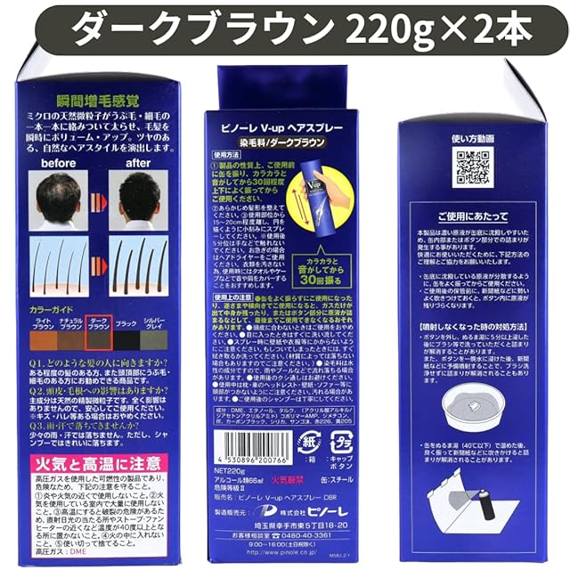 増量品220gx2本】ピノーレ ボリュームアップ V-up ヘアスプレー ダークブラウン 増量220g×2本 (薄毛隠しスプレー)