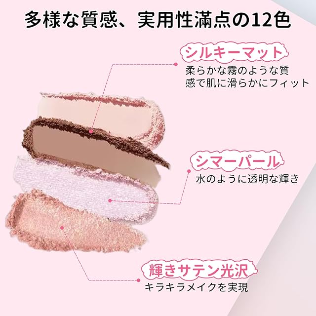 【魅力的な 12 色アイシャドウパレット】12色のピンクブラウン系カラーで、日常使いからパーティーメイクまで幅広いシーンに対応。マットとパールのバラマット&パールの最適バランスで、ナチュラルメイク アイシャドウから華やかな立体感メイクまで自由自在に表現できます。微粒子製法による粉質の細かさと密着性の高さで、長時間のメイク崩れ・粉飛びを防止。防水防汗処方で汗ばむ季節も安心です。