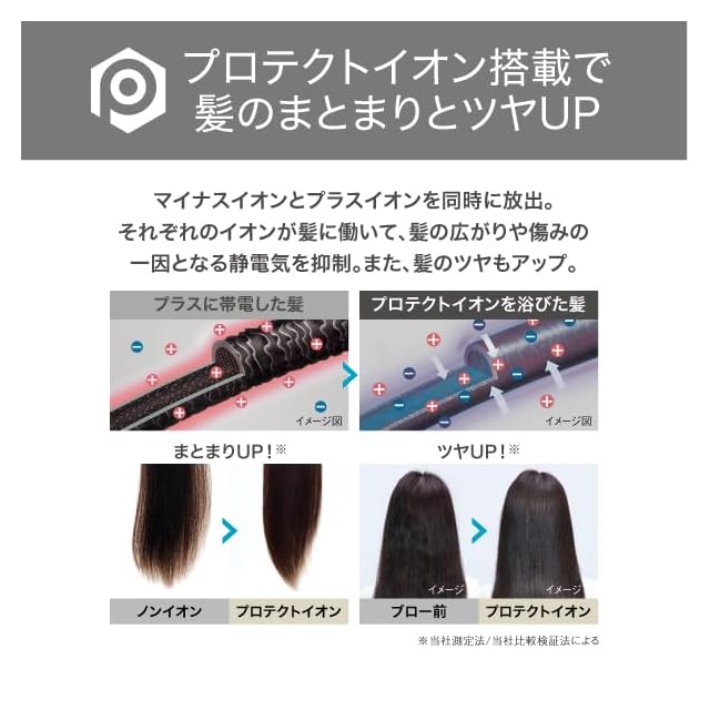 マイナスイオンとプラスイオンを同時に放出します。それぞれのイオンが髪に働いて、髪の広がりや傷みの一因となる静電気を抑制し、髪のツヤもアップします。