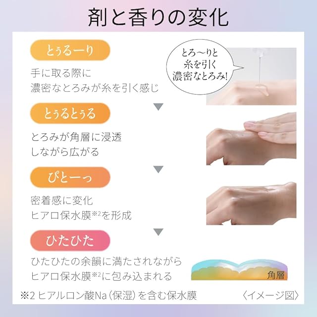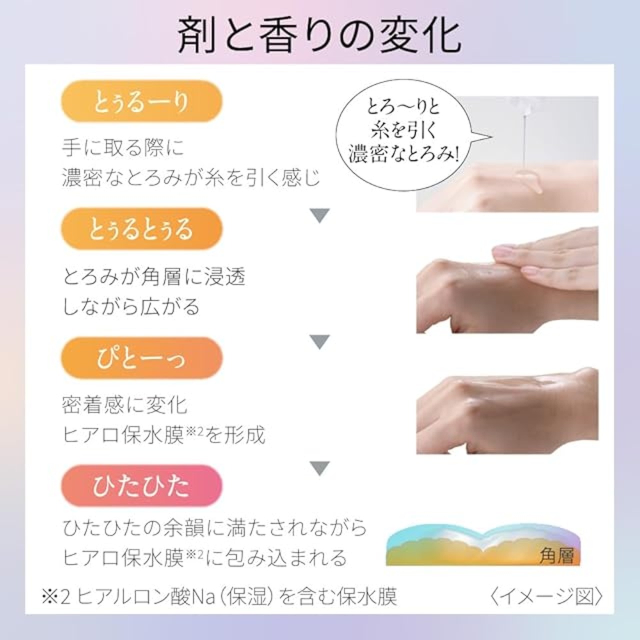 ヒアルロン酸Na(保湿)を含むヒアロ保水膜が、長時間、ずっとうるおいを与え続ける濃密セラム化粧液