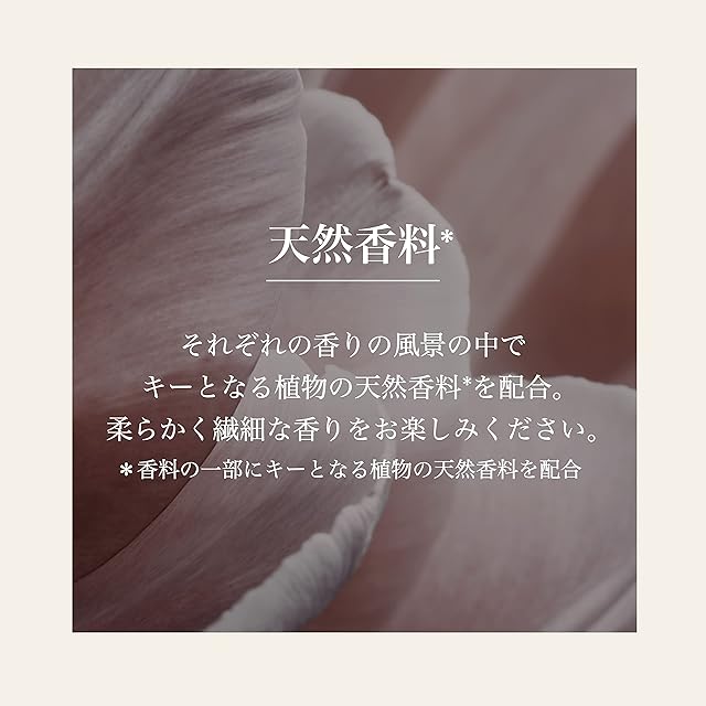 【POINT2:天然香料配合】香料の一部に、それぞれの香りの風景の中でキーとなる植物の天然香料*を配合した、「自然由来」の香りづくり。独自のキー香料で自分だけの世界を表現。*天然香料・・・ウィステリアハニー:ギョリュウバイ枝/葉油、イヴカシス:ハイブリッドローズ花エキス、ウッディグリーン:パチョリ油
