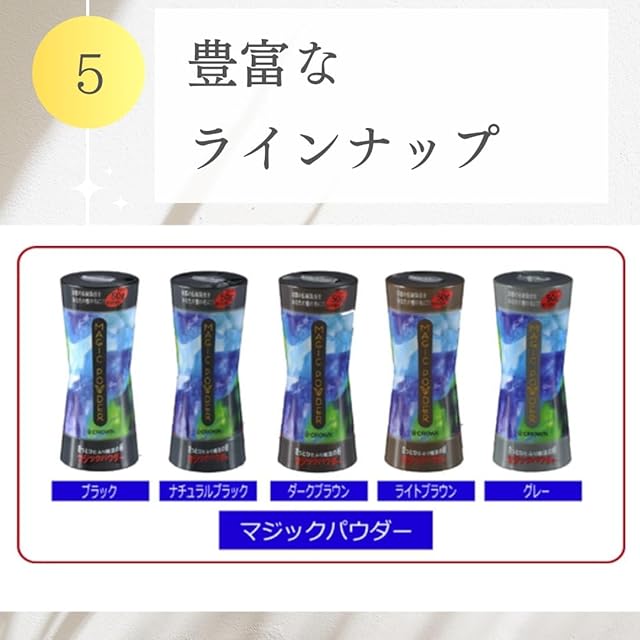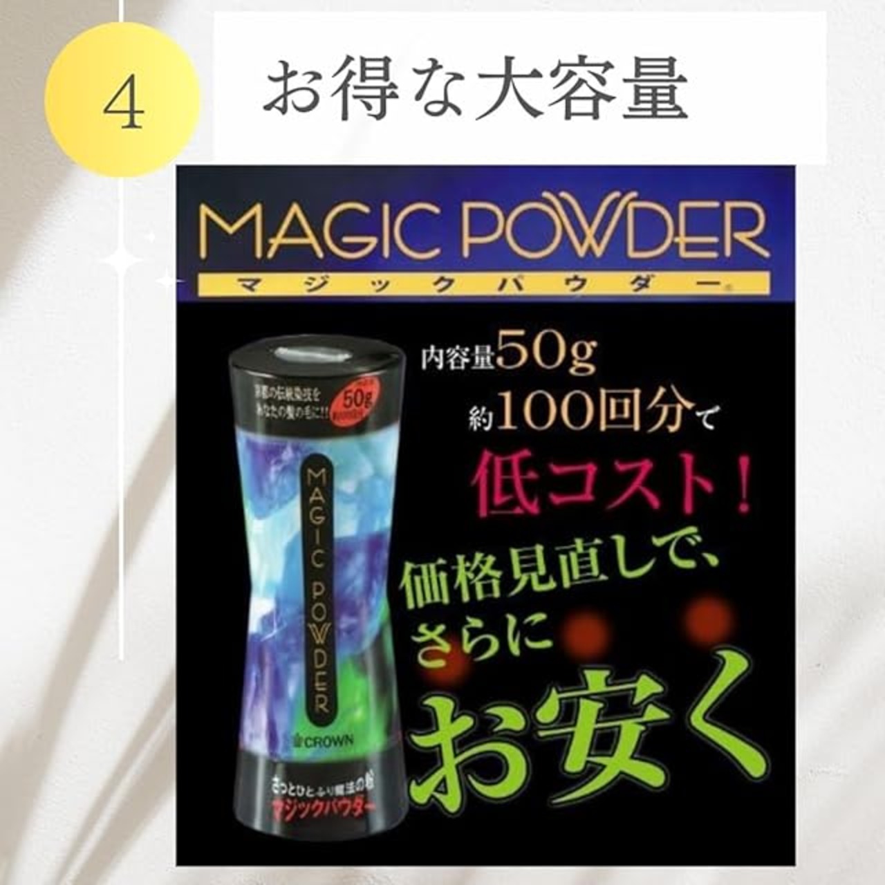 使用方法<br> 1.直接叩いてふりかける<br> 2.手で整える 3.ミストスプレーをする(乾くまで待つ)<br> 4.ドライヤーでパウダーが散布しないように軽く当てる<br> 5.ハードスプレーで固める<br> これだけだから簡単!早い!お出かけ前の5分間のみ!<br> <br> ● マジックパウダーは特殊加工された静電気を帯びた高温処理済みの植物性繊維(0.5mmに裁断した繊維)で、微細なパウダーになっており、ふりかけると静電気で髪や頭皮に付着し、気になる薄毛部分を自然にカバー出来たり、カラーのリタッチが簡単に手早く出来る商品です。<br> <br> ●黒髪の上から軽く違うカラーのマジックパウダー(ライトブラウン等)を振り掛けることで、簡単にイメージチェンジも可能です。<br> <br> <br> ●ツインキャップノズル <br> <br> マジックパウダーはツインキャップ・ツーウェイノズルシステムを取り入れています。 上部ノズルには144箇所の吐き出し口を持ち、広範囲用として使用できます。<br> 下部ノズルは中央を起伏させ、38箇所の吐き出し口を設け、髪の分け目やカラーのリタッチ等にピンポイント使用を簡単にできるように設計されています。<br> マジックパウダーの吐き出し口は、当社使用パウダーに合わせ、その口数・口径変更やテーパー変更・蓋の肉厚等、数多くの試作品を製作し、均等で上品なパウダーの吐き出しを探し出しました。<br> マジックパウダー開発に最も時間が掛かったのは、パウダーの吐き出し口です。 この結果、均等で上品なパウダーの吐き出し口を実現できました。副産物として、従来商品のようにボトルをひっくり返して使用する際に生じる、1回目の吐き出し量が多いという欠点も解消しました。<br> <br> ● 高温処理済繊維を使用していますので、より衛生的に使用することができ、髪や地肌に害は無く、養毛剤との併用も出来ます。<br> <br> ● 髪の薄い部分の頭皮と毛髪に付着して薄毛をカバーし、ふんわりとした、軽くて自然なボリューム感を得ることができます。<br> ● 髪を生やすのではなく、瞬時に髪が生えたように見せる、新しいスタイルの若返り増毛化粧方法です。<br> 本来の貴方の髪型にボリュームアップします。<br> ● 5年前、10年前の貴方の髪型に戻るので不自然さは無く、素早く低コストにて5年前、10年前の貴方に若返ります。<br> <br> ●髪の薄い部分に多少の産毛があり、地毛でカバーできる範囲であれば、ご使用いただけます。<br> <br> ● 皮膚にも優しい植物性繊維なので、毎日快適にご利用いただけます。<br> 使用後はシャンプーで簡単におとせ、年齢性別問わず、どなたでもご使用できます。<br> <br> ● 衣服等に付いても、軽く手ではたけば落ちますし、染料ではありませんのでシミにもなりません。<br> <br>