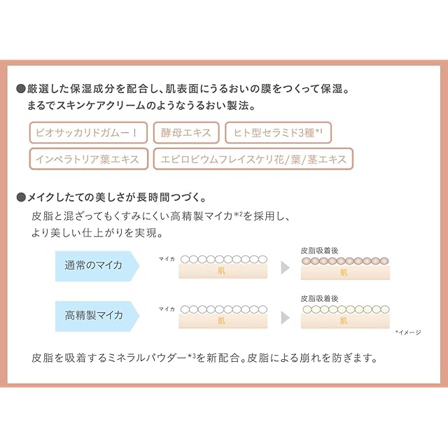 皮脂とまざってもくすみにくい高精製マイカ(着色剤)を採用し、より美しい仕上がりを実現。皮脂を吸着するミネラルパウダー(炭酸Ca)を新配合、皮脂による崩れを防ぎます。
