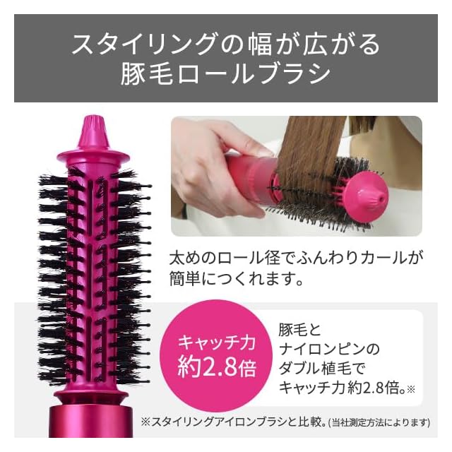 豚毛とナイロンピンのダブル植毛のブラシでキャッチ力約2.8倍※!径が太く、360度回転しながら豚毛が髪の毛をしっかりキャッチするので ふんわりとしたナチュラルなカールが簡単につくれます。※ スタイリングアイロンブラシと比較。(当社測定方法による)