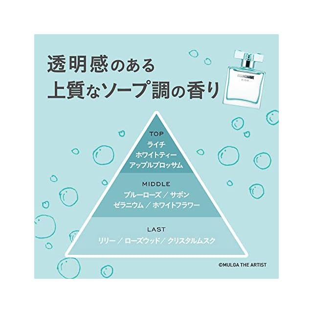 ・香り クリスタルムスクできらめく水面のような透明感を深みのあるブルーローズでみずみずしさを表現した上質なソープ調の香り。 清潔感のある洗練された印象を与えてくれます。 TOP ライチ/アップルブロッサム/ホワイトティー MIDDLE ブルーローズ/ゼラニウム/ホワイトフラワー/サボン LAST クリスタルムスク/リリー/ローズウッド