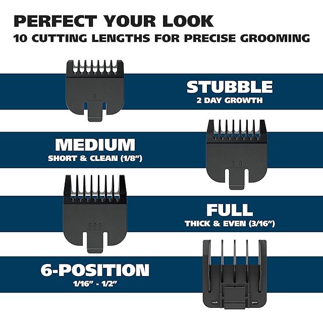 10種類のカット長さ - 1/8インチから½インチの10種類のひげトリミングの長さで様々なひげスタイルを実現。6ポジションガイド(1/16インチから½インチ)に加えて、無精ひげ(1/16)、ミディアム(1/8インチ)、フルガード(3/16インチ)が含まれます。