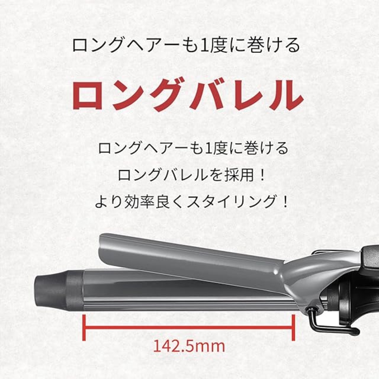 ロングヘアーも1度に巻けるロングバレル: ロングヘアーのお客様でも一度に巻ける ロングバレルを採用。 忙しいサロンワークでも効率的にサロンワークを する事ができます。