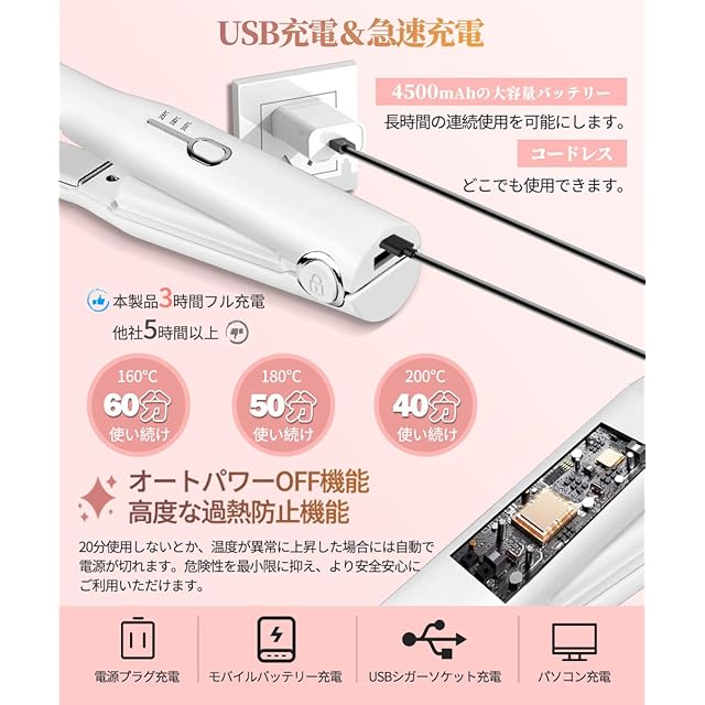 【大容量バッテリー・スマホを充電可能】このコードレスヘアアイロンは4500mAhのバッテリーを内蔵し、40 ~ 60分間の連続使用が可能です。輸電口を備えているので、スマホのバッテリーが切れたときに充電できるという安心感があります。