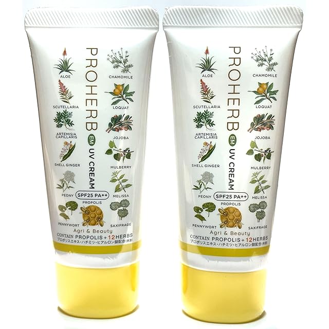 紫外線吸収剤フリーの化粧下地に使えるUVクリーム プロハーブUVクリームは紫外線吸収剤フリーの肌に優しい日焼け止めクリームです。日やけによるシミ・ソバカスを防ぎます。 毎朝のデイクリームとしてはもちろん、ファンデーションの前につける化粧下地としてもお使いいただけます。 特長 美容液成分をプラス 保湿・メイク保持効果アップ パッケージ素材は環境に配慮したものを使用。 スキンケアシリーズ共通成分として、プロポリスエキス、ハチミツ、ヒアルロン酸、コエンザイムQ10、カミツレ花エキスを配合。 米麹・EMX GOLD・ゲットウ葉エキス・ツボクサ葉エキス・セラミドNP・シリカ配合。 紫外線吸収剤フリーの肌に優しいUVクリーム。 SPF25(約8時間)PA++でしっかりと紫外線を防ぎます。 ほんのり肌色に色づいたクリームなので、化粧下地にも使えます。 無香料・合成着色料無添加。 こんな方におススメです 化粧を簡単に手早くすませたい方 肌でいつもお悩みの方 合成香料・着色料不使用の商品をお探しの方