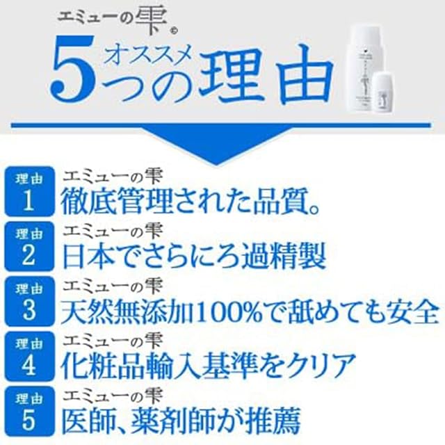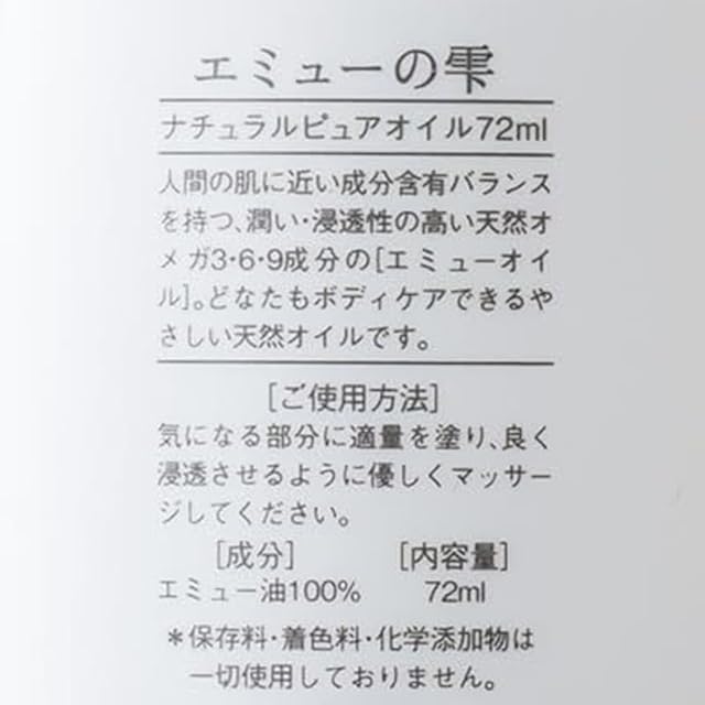 全成分表示:エミュー油100%(保存料・着色料・化学添加物は一切使用しておりません。)