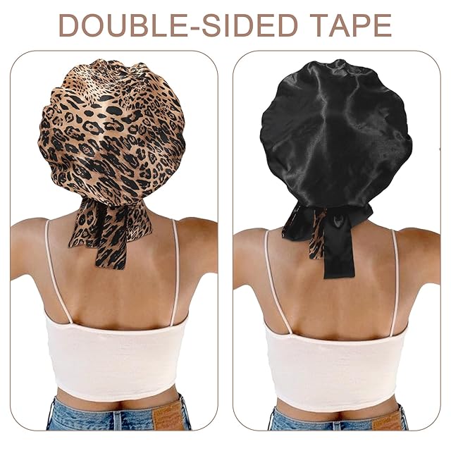 商品名:CHLINS サテンボンネット シルク スリープキャップ 女性用 - ストレッチタイバンド ヘアキャップ カーリーヘア - シルクラップ (ブラック+ヒョウ柄)